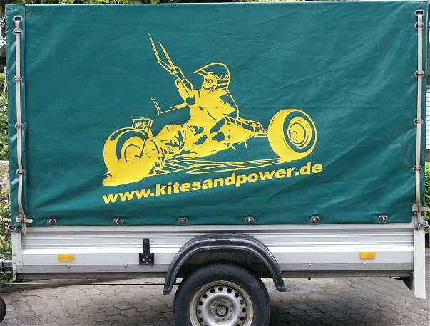 Hier wurde ein 5m Tail von Colours in Motion mit einem Schriftzug versehen. Dazu wurde wieder eine Vorlage aus Folie geschnitten, dann auf dem Tail angebracht, das Ganze nun mit schwarzer Farbe besprüht und fertig war die Applikation.