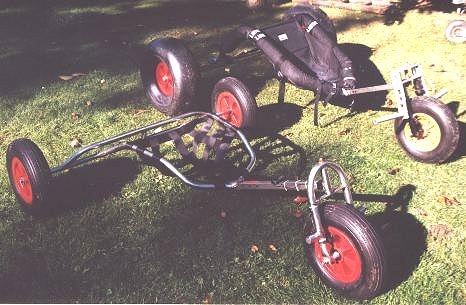 Hier seht Ihr deutlich den Unterschied zwischen dem alten und dem neuen Buggy. Durch die hochgezogenen Sitzrohre ergibt sich wesentlich mehr Seitenhalt während des Fahrens. Der Sitz wurde von mir gebraucht erworben. Auf diesem Foto ist der neue Buggy mit einer gefederten Vordergabel zu sehen.