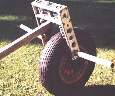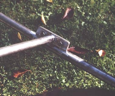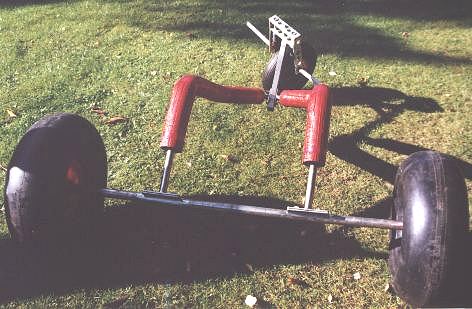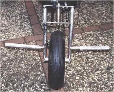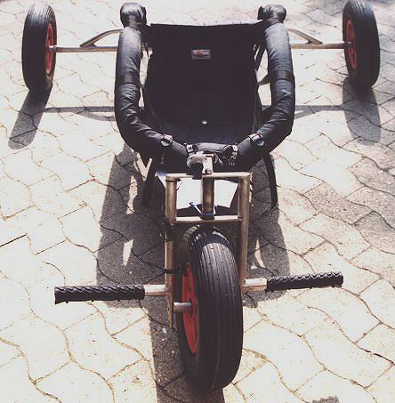 Aus alt mach neu. 3 Wochen Buggyurlaub hatten ihren Spuren hinterlassen. Kaum war ich zu haus, wurde der Buggy umgebaut. Er bekam neue Sitzrohre mit Klemmung a la Libre und an der Hinterachse wurden Steckachsen mit Sturz montiert. Im Vergleich zu den alten Sitzrohren erkennt man sofort, daß der hintere Winkel nun wesentlich flacher geworden ist und das vorne nun wesentlich mehr Platz für die Oberschenkel vorhanden ist. Der Winkel der Deichselstange ist nun auch flacher geworden. Durch diese Maßnahmen sitzt man nun tiefer im Buggy und die Gefahr des Umkippens ist weitgehend eliminiert worden. Die geänderten Maße des Buggy sind aber nicht in dem Bauplan eingezeichnet. Die Fußrasten wurden mit einem Fahrradmantel (Mountainbike) umgeben. Der Mantel wurde mit Kabelbindern fixiert. Dadurch hat man mehr Grip auf den Fußrasten