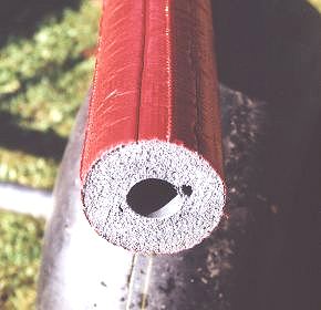 Hier sieht man das Schutzmaterial für die Sitzrohre und ein Foto der Sitzrohr- Hinterachse Verbindung. Das Isoliermaterial ist vom örtlichen Heizungsbauer bezogen worden. Es ist aus einem recht harten Schaum, der zusätzlich mit einem Schrumpfschlauch überzogen ist. Die Maße sind 80mm Außendurchmesser und 30mm Innendurchmesser. Eine 2m Stange des Materials kostet ca 20.-DM.