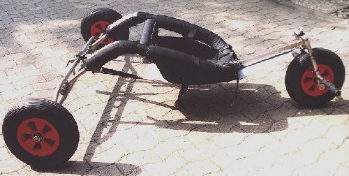 Die Edelstahlrohre und das Flachmaterial habe ich alles vom Schrott organisiert. Das kostete ca. 40.-DM. Drei Räder mit Kugellager kosten 150.-DM, der Sitz mit Zubehör kostet ca. 200.-DM. Man kann also für unter 500.-DM einen Buggy bauen der 1300.-DM kostet. Voraussetzung sind allerdings die Werkzeuge und ein wenig Wissen im Metallbau.