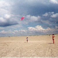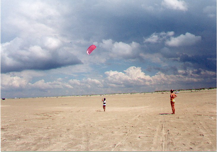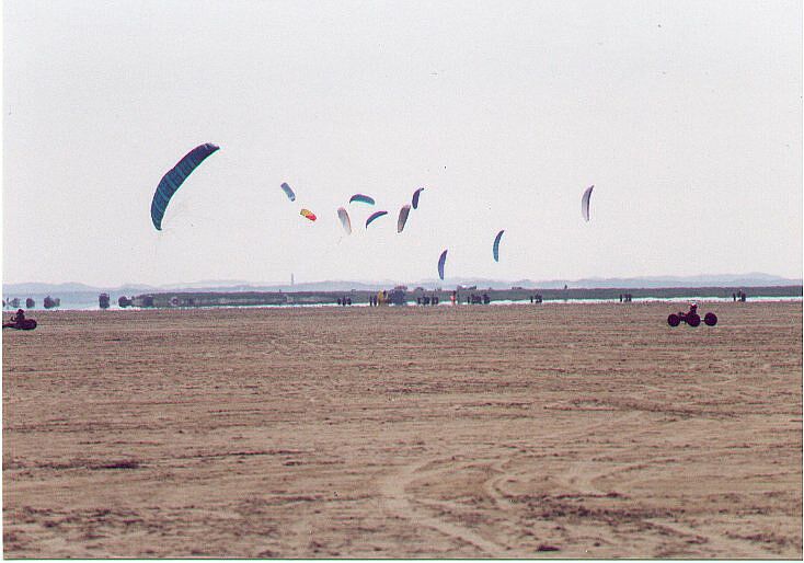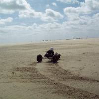 Nach 7 Stunden gemütlicher Fahrt trudelte ich dann mit meiner Familie auf Römö ein. Am Abend wurde dann auch gleich das Buggygelände begutachtet. An Fahren war aber nicht zu denken. Das Geländ stand unter Wasser und der Wind war gleich null. Am nächsten Tag war das Wasser aber abgetrocknet und des Sand relativ hart. Für die ersten Fahrten benutzte ich dann auch normale Schubkarrenräder. Mit meinen Söhnen im Gespann konnte ich dann auch mit der 6er Bora um 45 km/h fahren. Den Kinder machte es auch eine Menge Spaß. Ich bin jeden Tag nur 90 - 120 Minuten gefahren, da meine Frau mit den Kindern am Strand von Lakolk lag. Buggyfahren und Familienurlaub paßt eben nicht richtig zusammen. Mir reichte das aber auch, da das Fahren ohne Kumpels schnell langweilig wird. Die ersten Tage erreichte dann auch Topspeeds von 68 km/h. Das Gelände wurde aber immer schlechter, da die GPA Fahrer für das Buggycamp übten. Nach einer Woche sah der Sand aus, wie eine Kraterlandschaft und man konnte ordentliche Geschwindigkeiten nur noch mit kompletter BF Bereifung erreichen. Da ich aber an der Vorderachse nur normale Bereifung hatte, war nur noch Geschwindigkeiten um 45 km/h drin.