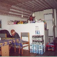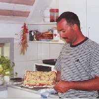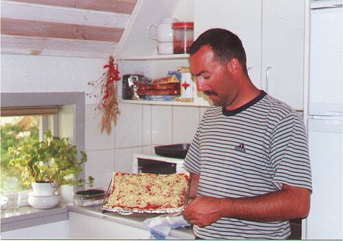 Noch ein paar Bilder vom Haus und vom Strand. Wie man sieht war für das leibliche Wohl gesorgt. Für 3 Wochen war ich Chef in der Küche und durfte obendrein auch immer fleißig abwaschen. Auf dem einen Bild mache ich gerade Pizza. Das ist ja nichts besonderes, aber der Ofen war so klein, daß die Pizza nur die Ausmaße eines DIN A4 Blattes bekam. So mußte dann in Etappen gebacken werden. Geschmeckt hat es aber trotzdem. Als Gerichte gab es frische Kartoffelpuffer, Fisch, Schnitzel, die obligatorischen Spagetti, Gegrilltes, Maiskolben, Pizza und natürlich Hot Dogs.